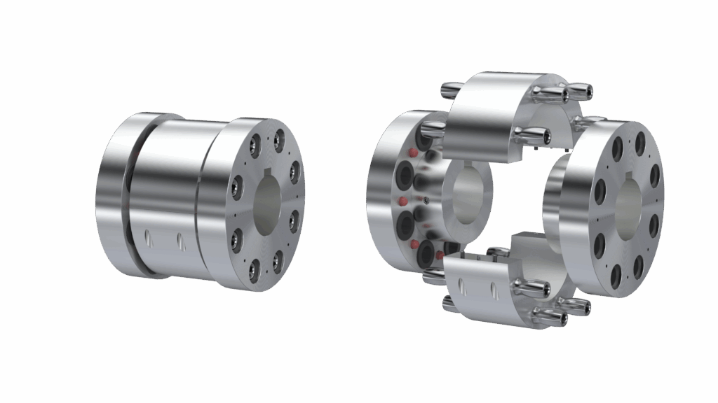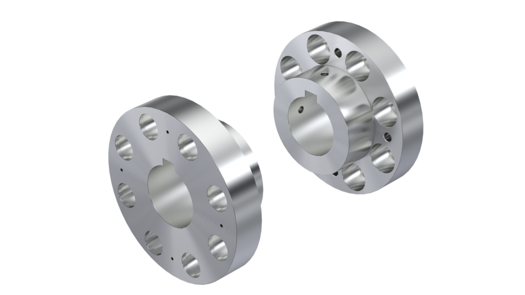 Request a QuoteThis configuration of hubs carrying bushings and a split spacer with pins allows for pin removal/installation through the inverted hubs. This arrangement can accommodate Parallel, Axial and Angular Misalignment.